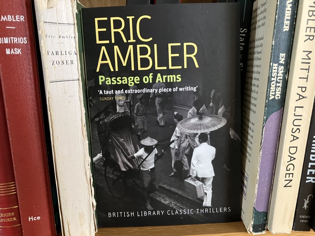 Eric Amblers böcker lever fortfarande. Passage of Arms publicerades 1959 men den här utgåvan kom 2016. Den handlar om en indisk man, Girija Krishnan, som hittar gömda vapen i djungeln och ett amerikanskt par som turistar i Asien och som blir indragna Krishnans planer på att sälja vapnen, förmodar jag. Den amerikanske mannen kommer in i en farlig värld med postkoloniala rebeller, kinesiska vapensmugglare och islamiska revolutionärer. Allt enligt baksidestexten.