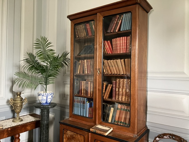 Förra veckan besökte vi Ekenäs slott. Det är ett renässansslott i Östergötland (med barocktak, upplyste guiden). Från 1930-talet stod slottet obebott och byggnadens skick blev sämre och sämre, men på 1970-talet renoverades slottet och blev museum och då ville man skapa ett rum som bibliotek. Så vitt jag förstår ville man ha bokhyllor överallt och bruna träpaneler men vid renoveringen kom fina 1700-talsväggar fram. Kompromissen blev det här bokskåpet för att ändå ge en känsla av bibliotek.