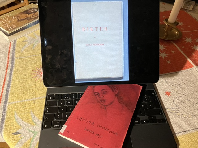 Att få tag på Sully Prudhommes dikter i svensk översättning är inte det lättaste men de finns digitaliserade. Den upplaga jag har i datorn på bilden är Dikter af Sully Prudhomme i översättning af Göran Björkman från 1889. Den kan ni hitta i Libris. Det finns en till digitalisering av Sully Prudhommes dikter. Här är länk till Lyriskadikter af Sully Prudhomme i svensk tolkning af Teresia Eurén från 1901. Vilken som är bäst att läsa vet jag inte. Man får pröva sig fram. Det jag kan säga är att Göran Björkman (1860-1923) hade betydligt högre utbildning än Teresia Eurén (1869-1952) och han fick också ett översättarpris för översättningar från portugisiska och spanska. Båda de här digitaliserade upplagorna kan den som vill ladda hem och läsa gratis.